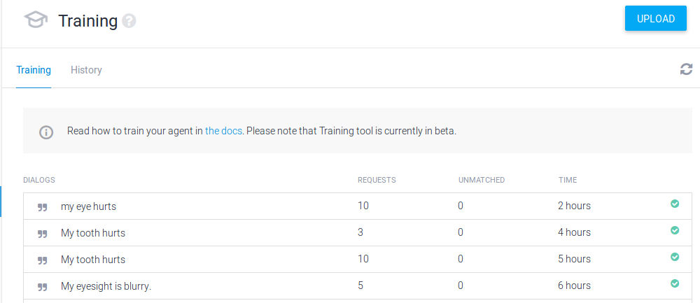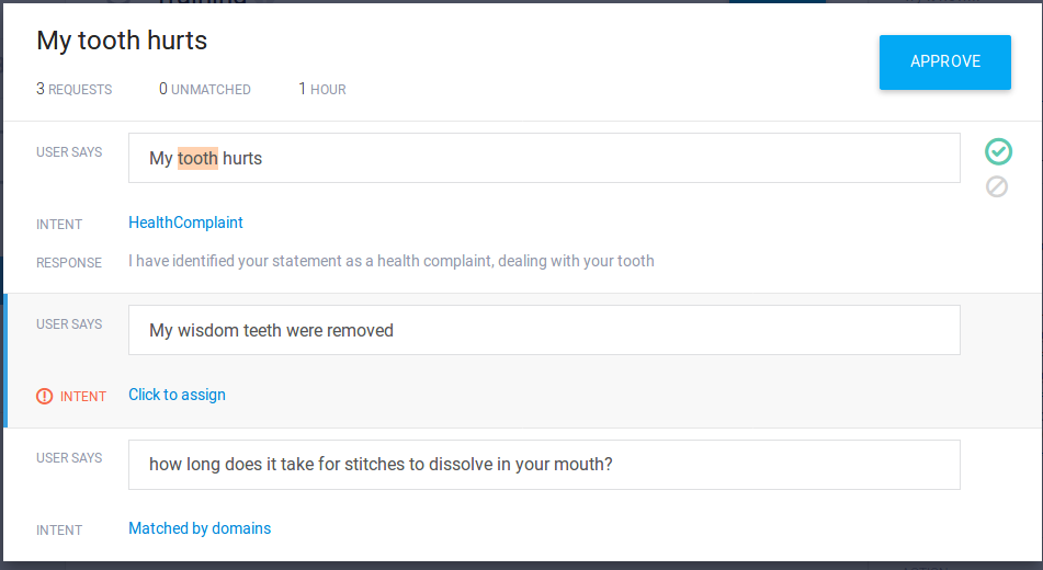 In the case of the Health Complaint intent, I had not formally set a context, so each statement is not seen as linked to the previous one and is more likely to be processed as a completely independent event.  This was partly because I just wanted to see if Wilbur could be trained to recognize simple one-sentence complaints.  Setting a context for an intent is more useful when trying to build a bot/assistant that can handle a whole conversation (a more complex task).